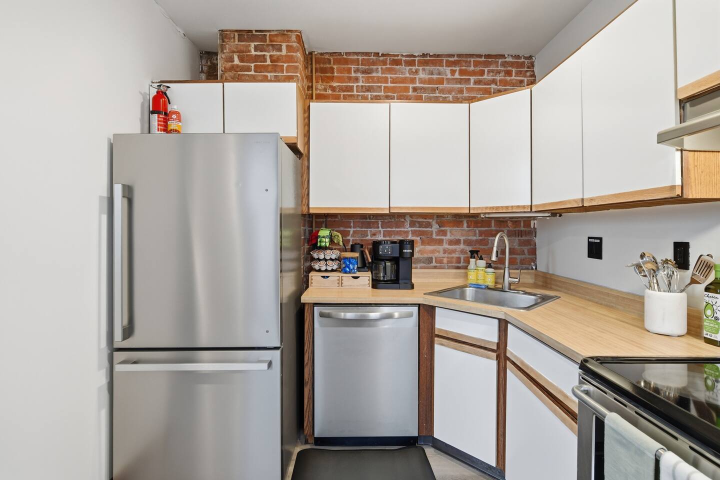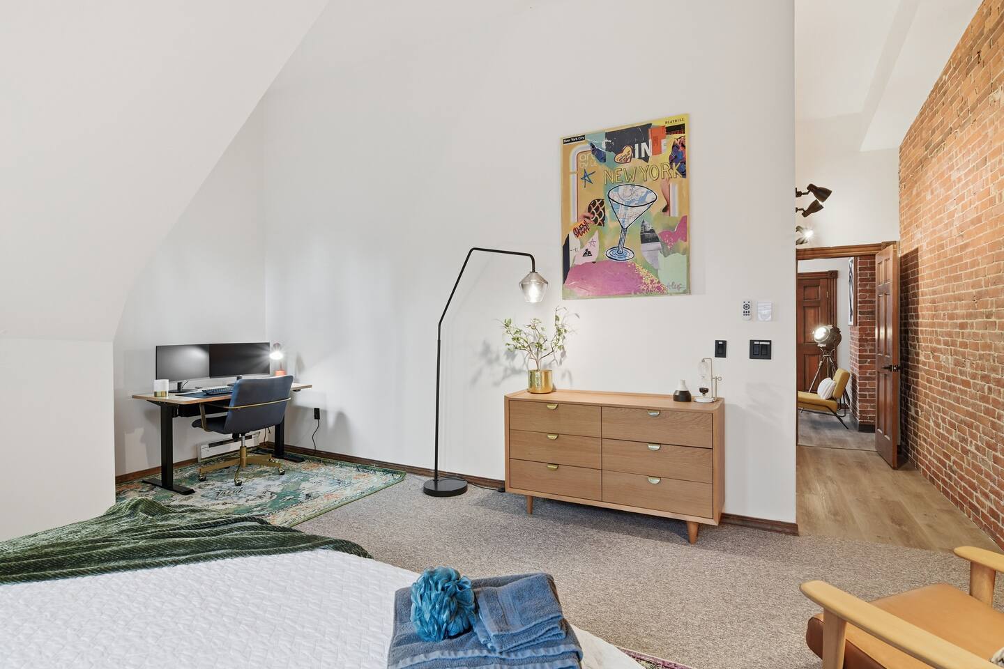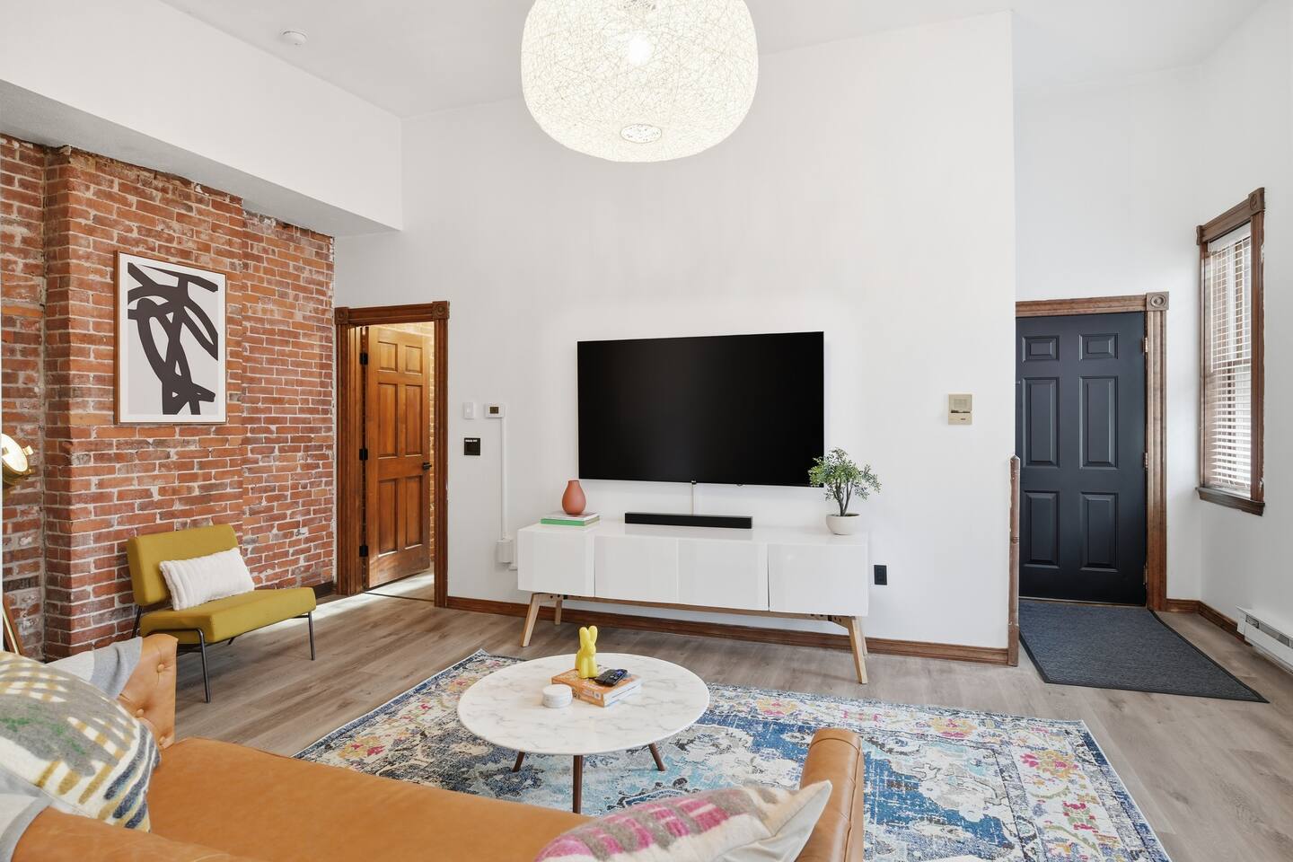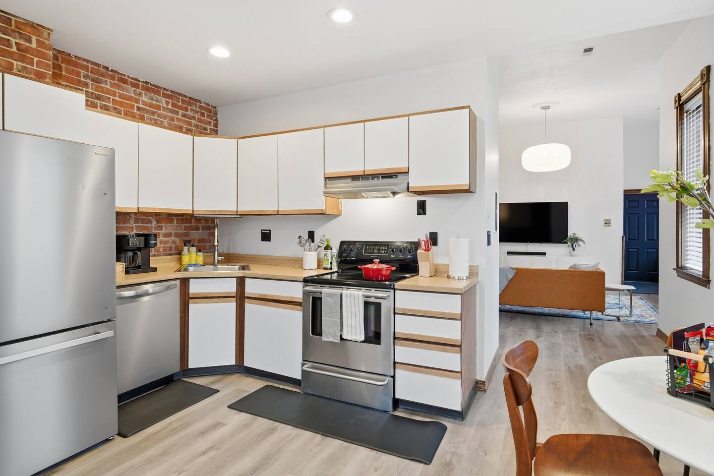 The bedroom is furnished with a king-size memory foam bed and a desk with a monitor, docking station, and everything needed to get work done from home. The living room is furnished with a nice 70-inch flat-screen TV where you'll be able to Netflix and chill with friends. Enjoy the massive exposed brick wall stemming the length of the apartment. Inside the kitchen, you'll find all the silverware, stainless steel pots and pans, and plates you need to cook yourself dinner from scratch! In terms of amenities, we've got you covered too! You'll have access to important things like An iron, blow dryer, towels, soap, napkins, body wash, and more.