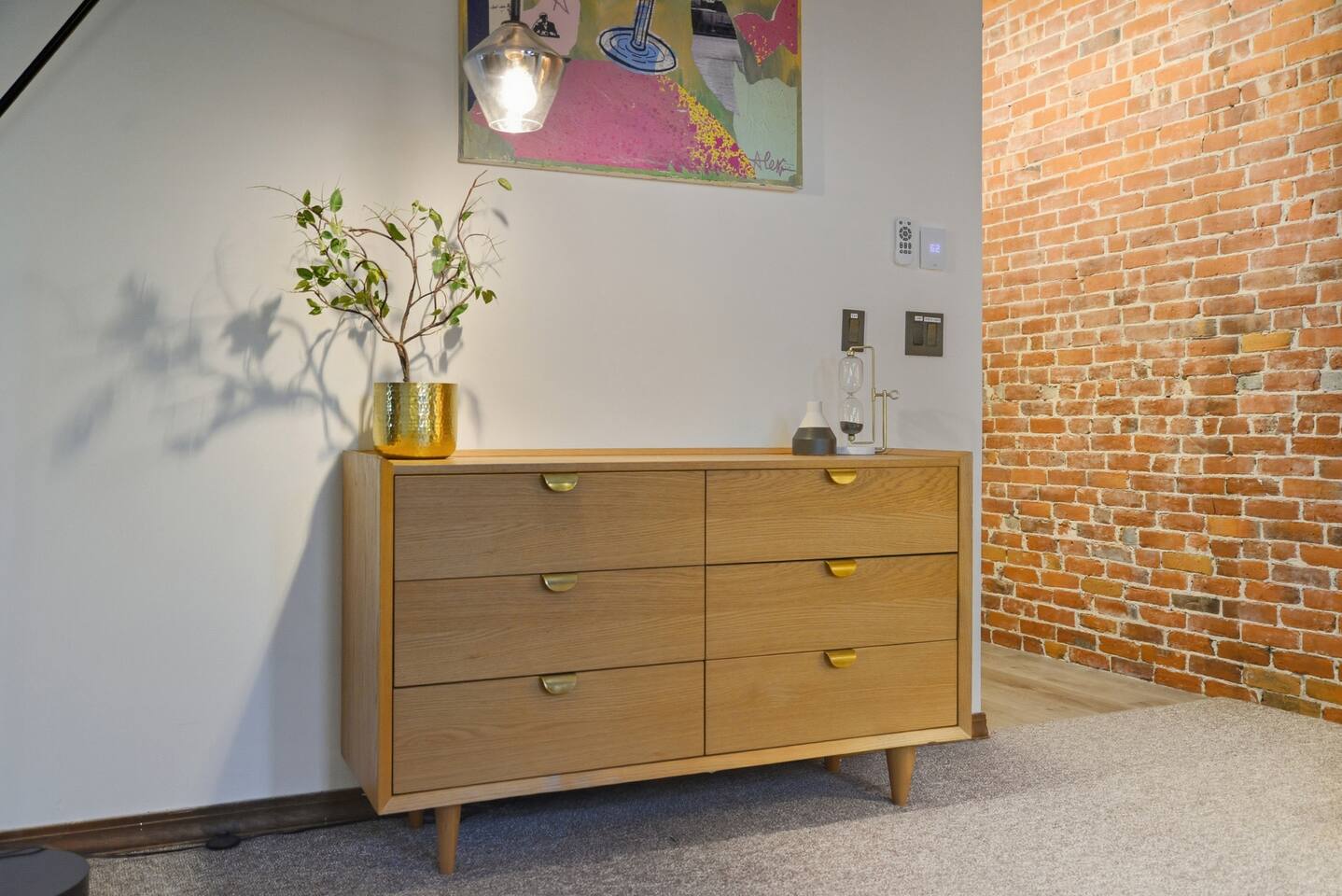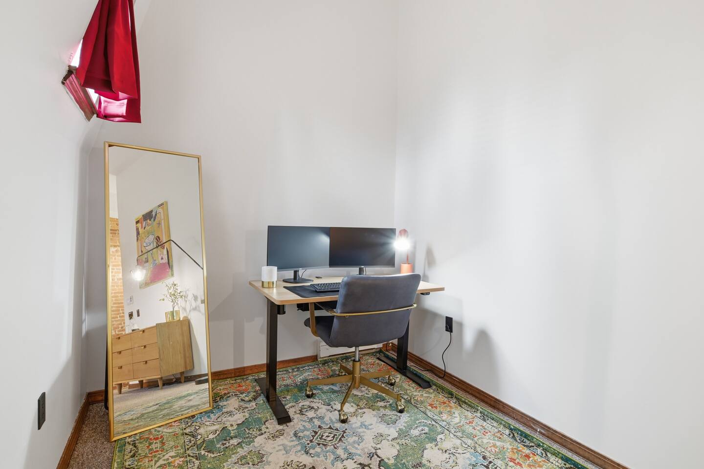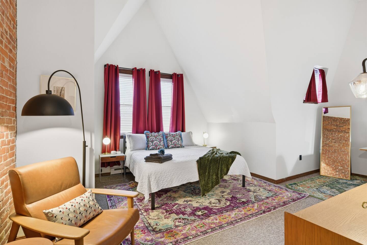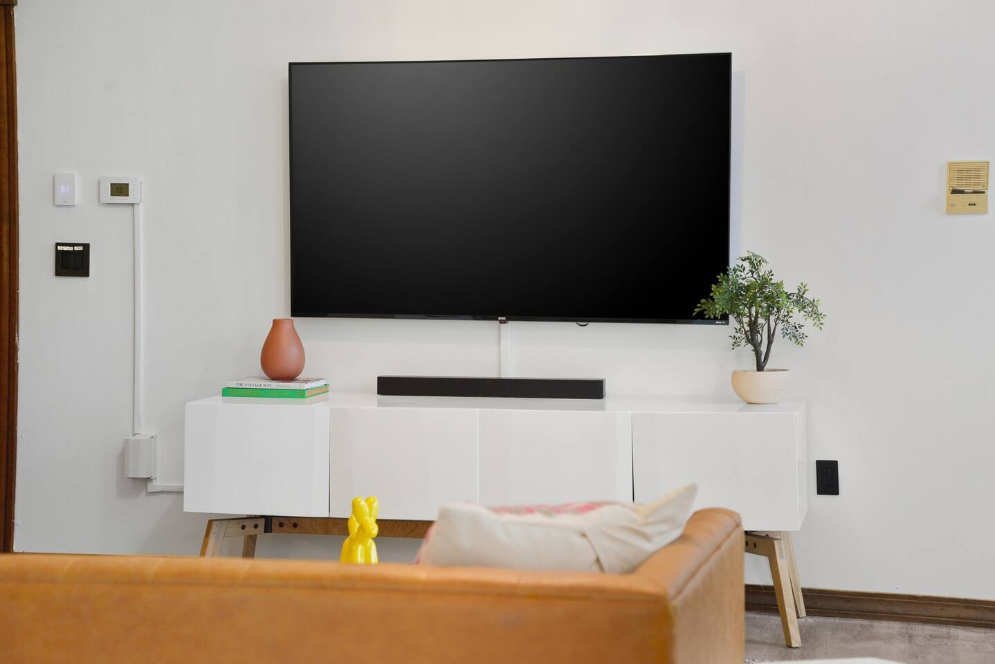 The bedroom is furnished with a king-size memory foam bed and a desk with a monitor, docking station, and everything needed to get work done from home. The living room is furnished with a nice 70-inch flat-screen TV where you'll be able to Netflix and chill with friends. Enjoy the massive exposed brick wall stemming the length of the apartment. Inside the kitchen, you'll find all the silverware, stainless steel pots and pans, and plates you need to cook yourself dinner from scratch! In terms of amenities, we've got you covered too! You'll have access to important things like An iron, blow dryer, towels, soap, napkins, body wash, and more.