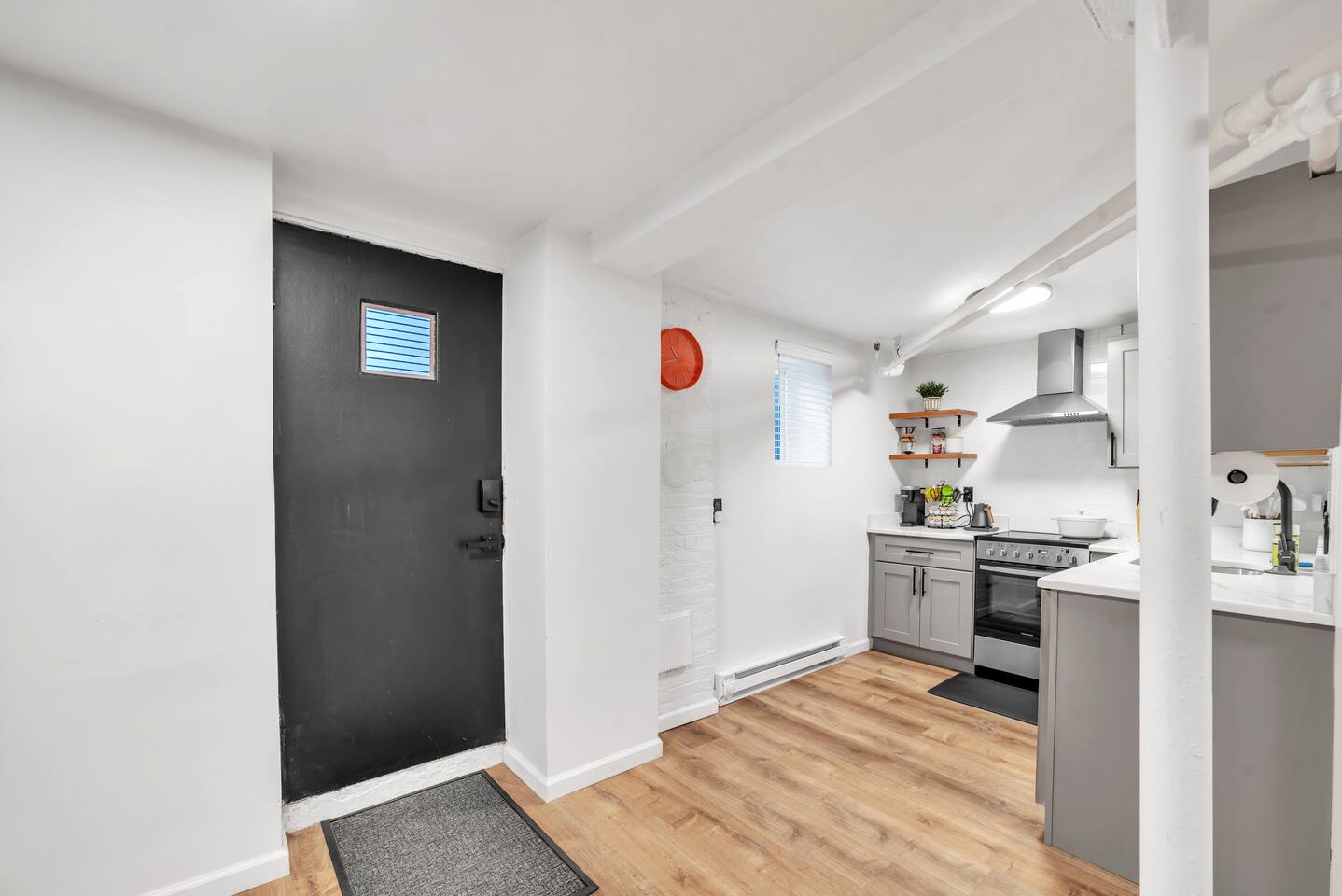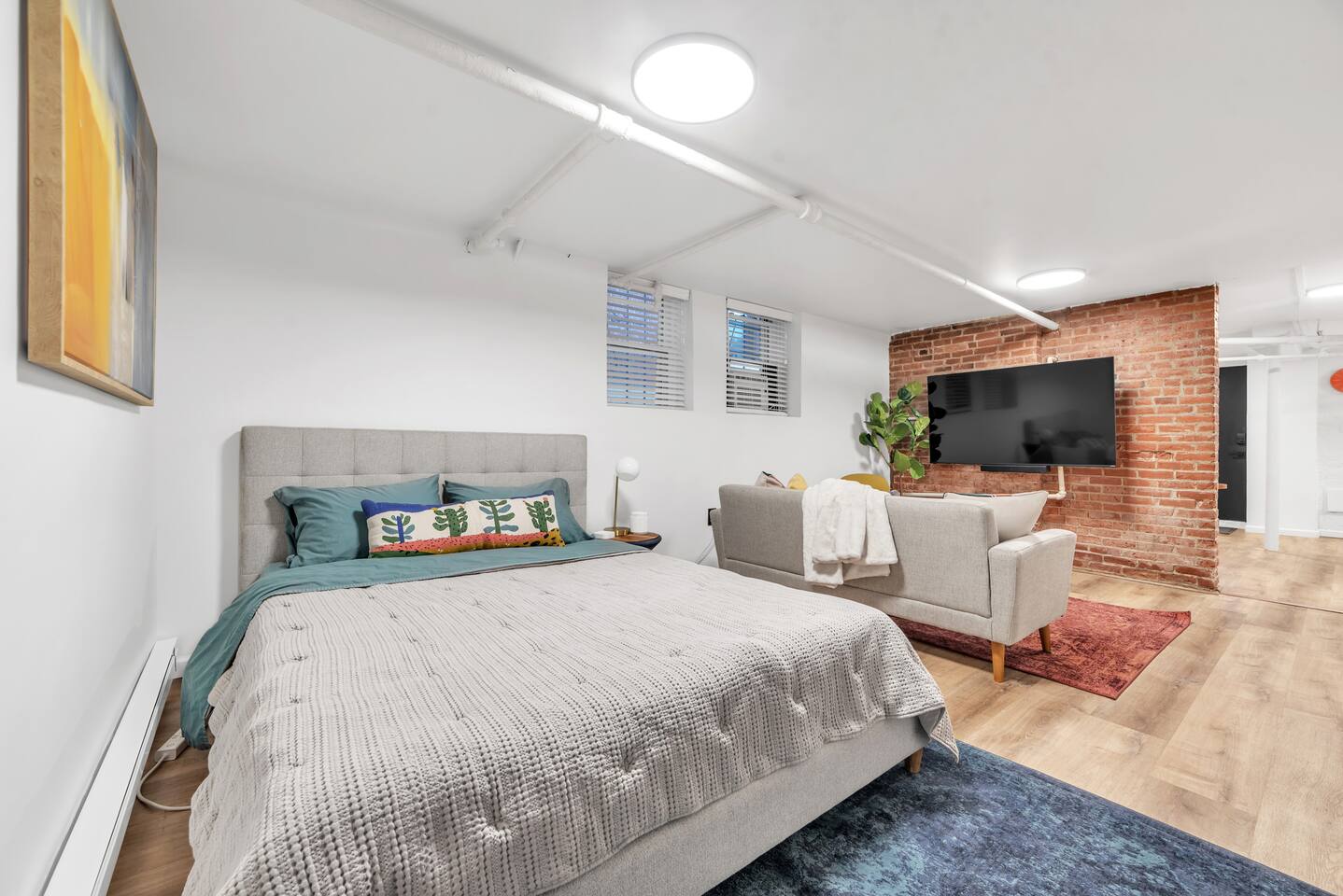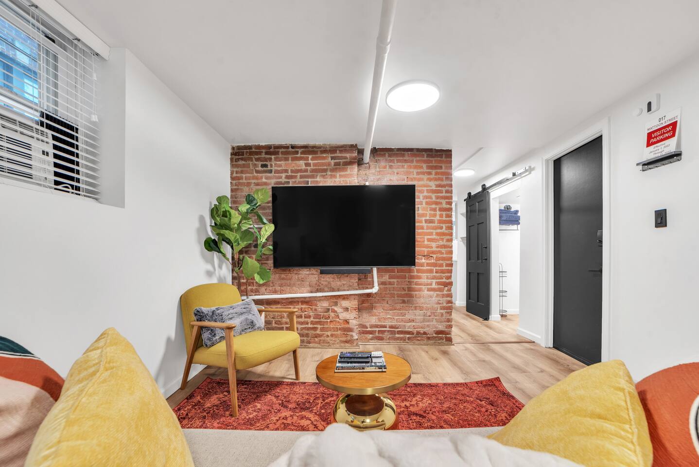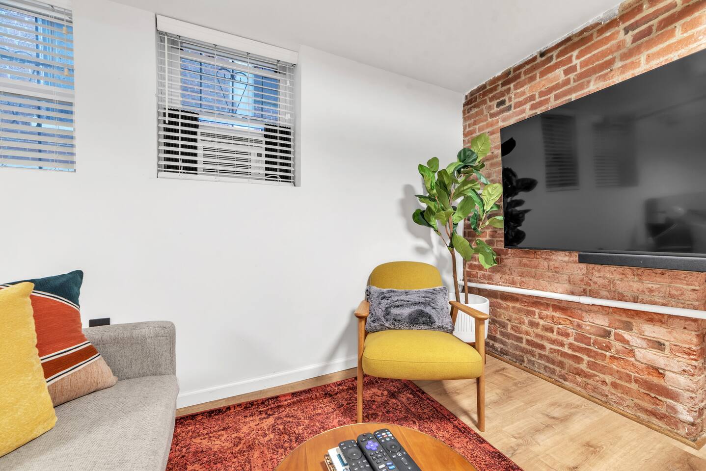 🛏️ Sleeping Area The apartment features a queen-size memory foam bed, thoughtfully placed next to a spacious closet for comfort and convenience. 📺 Living Area Relax in the living space with a 70-inch smart flat-screen TV set against a beautiful exposed brick wall, perfect for streaming your favorite shows and movies. 🍳 Kitchen The kitchen is fully equipped with silverware, stainless steel pots, pans, and plates, making it easy to prepare meals at home. 🧴 Amenities & Essentials Guests are provided with everyday essentials including an iron, hair dryer, fresh towels, soap, napkins, body wash, and additional toiletries to ensure a comfortable stay. ❄️ Seasonal Note Window AC units are available during warmer months, typically late spring through early fall, and are removed in winter to ensure proper maintenance and insulation.