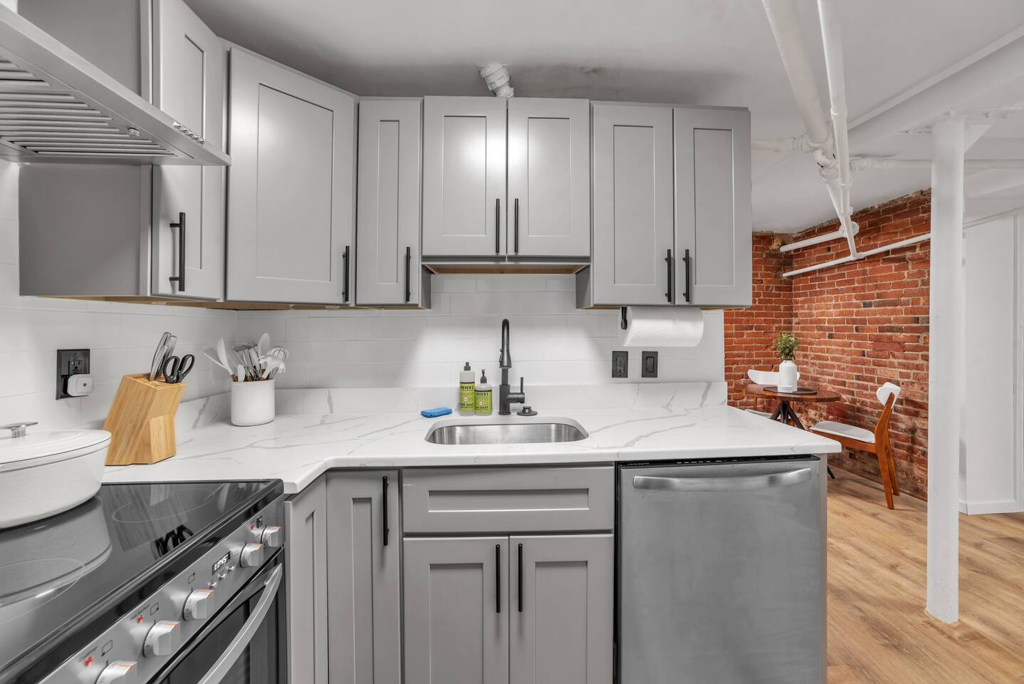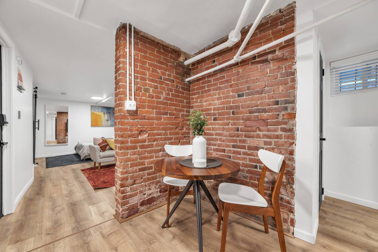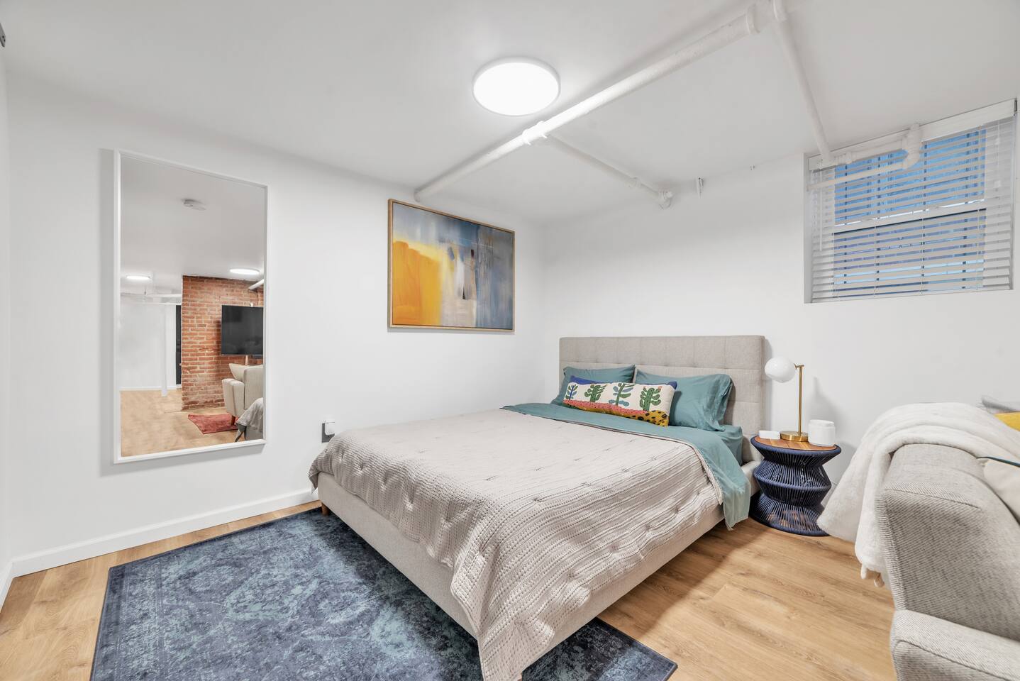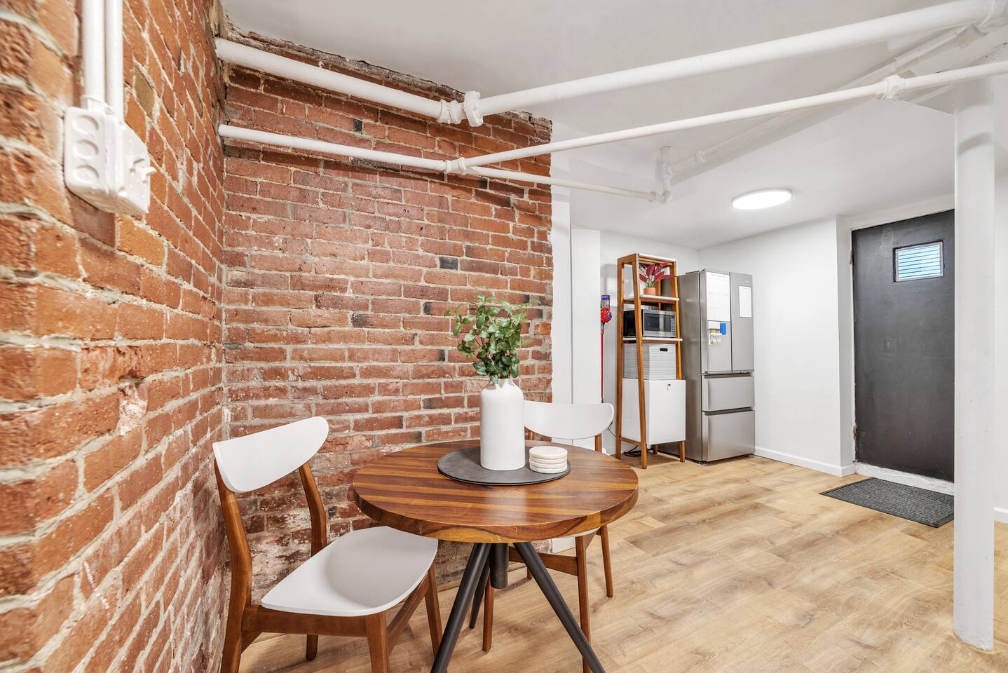 🛏️ Sleeping Area The apartment features a queen-size memory foam bed, thoughtfully placed next to a spacious closet for comfort and convenience. 📺 Living Area Relax in the living space with a 70-inch smart flat-screen TV set against a beautiful exposed brick wall, perfect for streaming your favorite shows and movies. 🍳 Kitchen The kitchen is fully equipped with silverware, stainless steel pots, pans, and plates, making it easy to prepare meals at home. 🧴 Amenities & Essentials Guests are provided with everyday essentials including an iron, hair dryer, fresh towels, soap, napkins, body wash, and additional toiletries to ensure a comfortable stay. ❄️ Seasonal Note Window AC units are available during warmer months, typically late spring through early fall, and are removed in winter to ensure proper maintenance and insulation.
